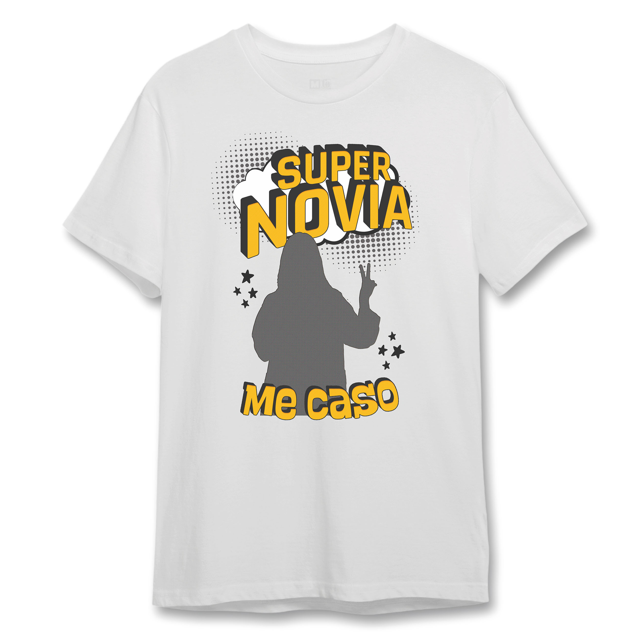 El diseño SÚPER es para novios con superpoderes. Personaliza tu camiseta con tu foto y luce la frase “Me caso” al estilo cómic. Disponible con personalización a dos caras. ¡Listos para salvar el día! Entrega exprés 24/48h. Gastos de envío gratis.